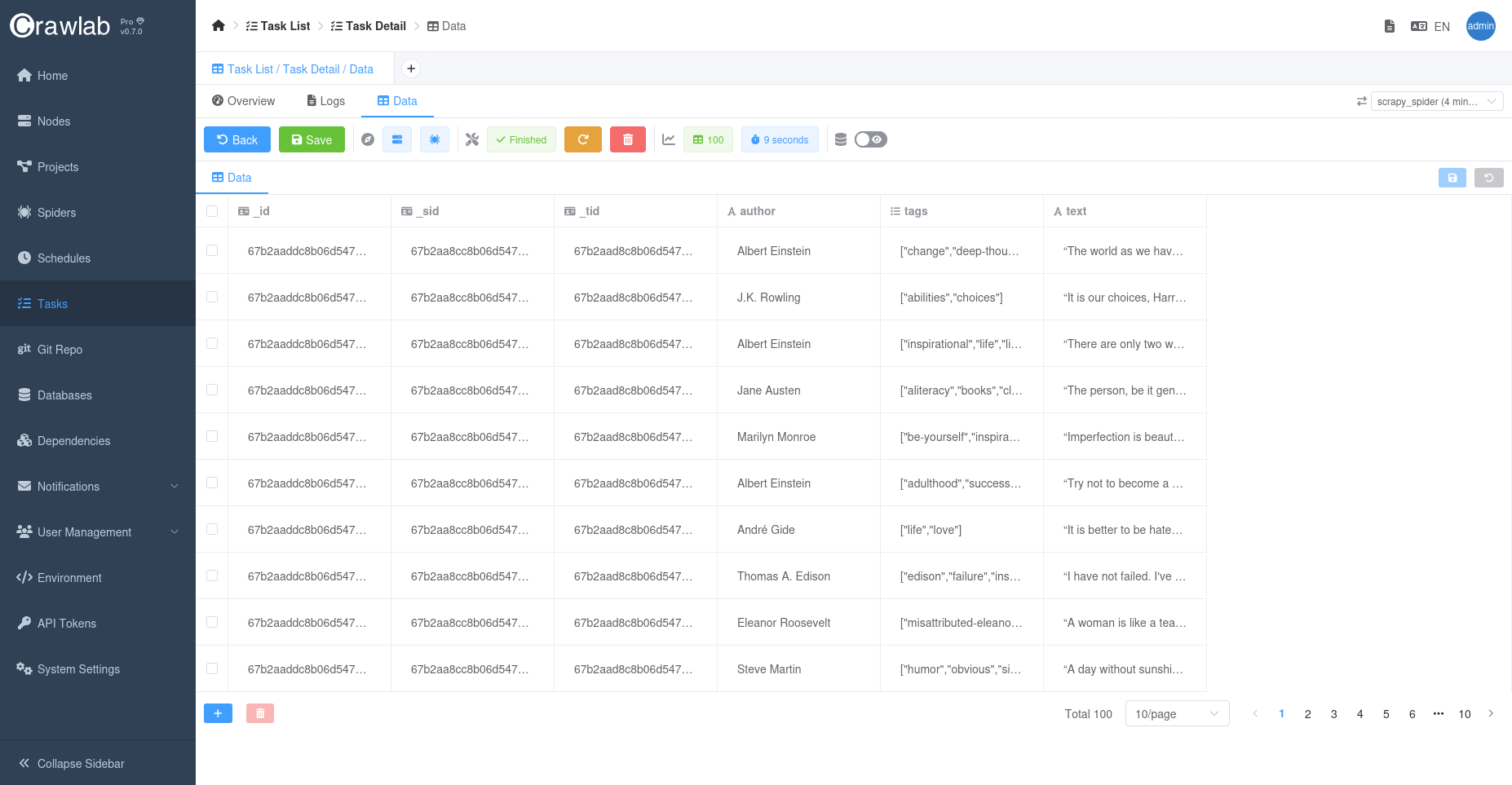 In this tutorial, we are going to create a spider that crawls quotes by famous people on a mock site provided by Zyte (the company behind Scrapy); then we will run it on Crawlab to extract data from the site; finally, we will view the crawled data visually on Crawlab.